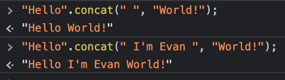 두번째는 " I'm Evan "을 기준으로 "Hello"와 "World!"를 연결시키고 있습니다. (양 옆으로 공백이 있음에 유의합니다. 무슨 뜻을가진건 아니고 제가 그냥 넣은겁니다.)