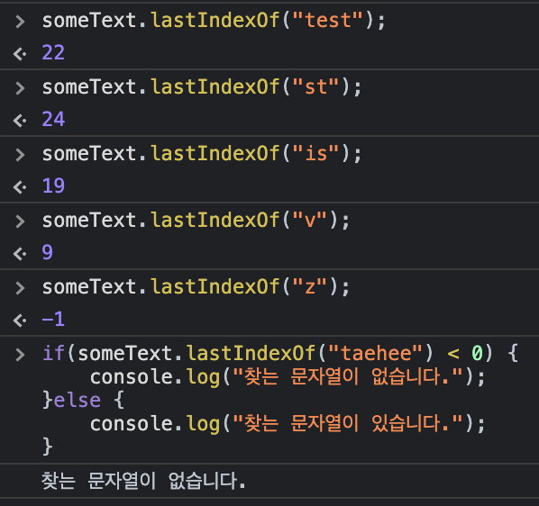 위의 indexOf의 반대라고 생각하면됩니다. 찾고싶은 문자열을 처음부터가 아닌 끝에서부터 찾기 시작합니다. 찾았다면 찾은 단어의 인덱스 첫번째값, 못찾았다면 -1을 반환합니다.