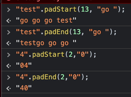 이 함수 두개는 문자열.padStart(글자수, 이어붙일문자열)과 같은 형식으로 되어있는데 최종결과들을 자세히 보면 결국 글자수에 해당하는 길이만큼의 문자열로 만들어주는것이므로 이미 저 글자수만큼의 길이를가진 문자열은 결과에 변화가 없고 글자수만큼의 길이를 가지지 못한 문자열만 결과에 변화가 생겼다고 생각을하니 조금 더 이해를 쉽게할수 있었습니다.