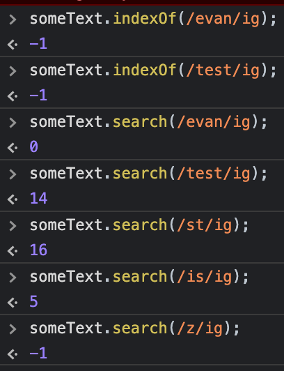 제일 처음 예제를 보면 일부러 제가 indexOf안에 정규식을 넣어봤는데 분명히 someText안에는 "test"와 "evan"이라는 문자열이 있음에도 -1(값이없음)을 반환하는것을 볼수있습니다. 반면에 바로 아래 search 함수에서는 "test"와 "evan"이 발견된 첫 인덱스를 정상적으로 반환합니다. 이것이 indexOf와 search의 차이입니다. 또한 search도 역시 문자열을 발견하지 못하면 -1을 반환하는것을 알수있습니다. 슬래쉬 뒤에 ig의 뜻은 i는 (Ignore) 대소문자 구분을 안하겠다라는 뜻이고 g는 (global)의 약자로 문자열 전체에서 찾겠다는 말입니다. 자세한 정규식의 내용은 추후 다루겠습니다.