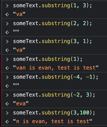 7번은 끝 인덱스가 비정상적으로 큰 경우인데 이럴경우 끝 인덱스는 someText.length로 자동으로 바뀌어 실행됩니다 즉, 3번인덱스부터 문자열의 끝까지의 문자열을 반환합니다.
