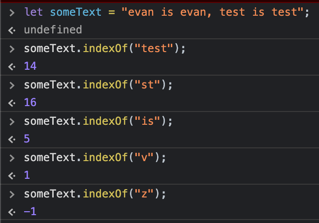 다섯번째는 someText에 없는 문자를 의도적으로 찾게했는데 "z"는 없으므로 -1을 반환하는것을 알수있습니다.