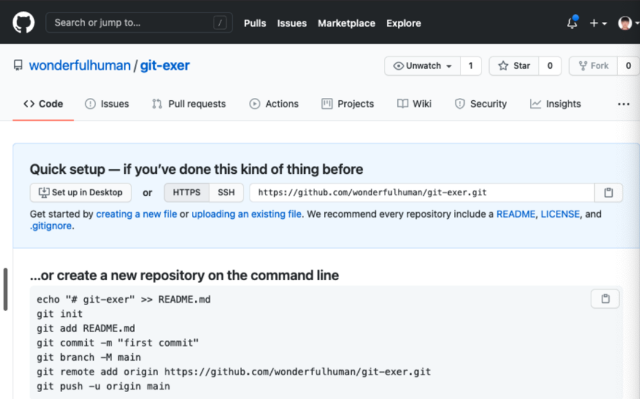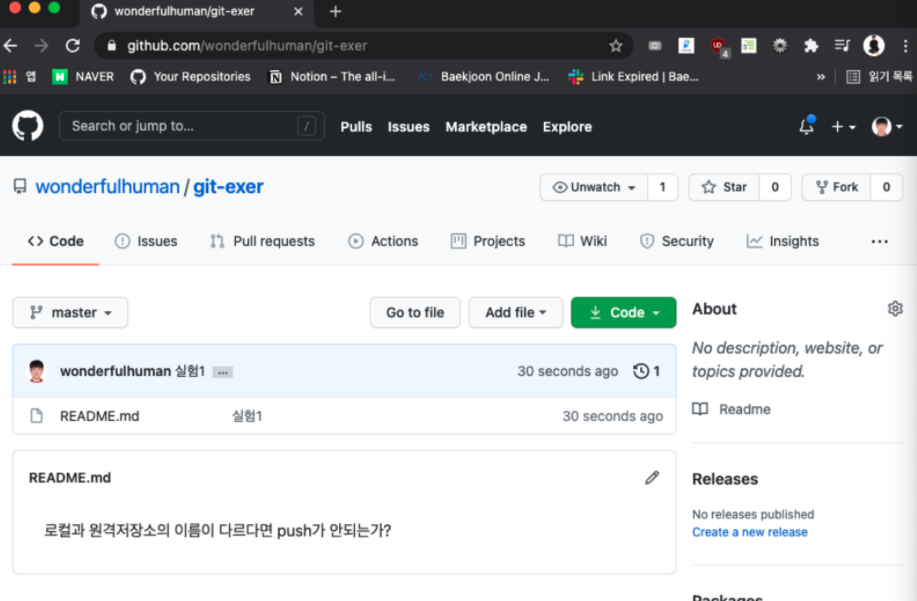 우선 깃허브에 이름이 git-exer인 원격저장소를 하나 만들었다