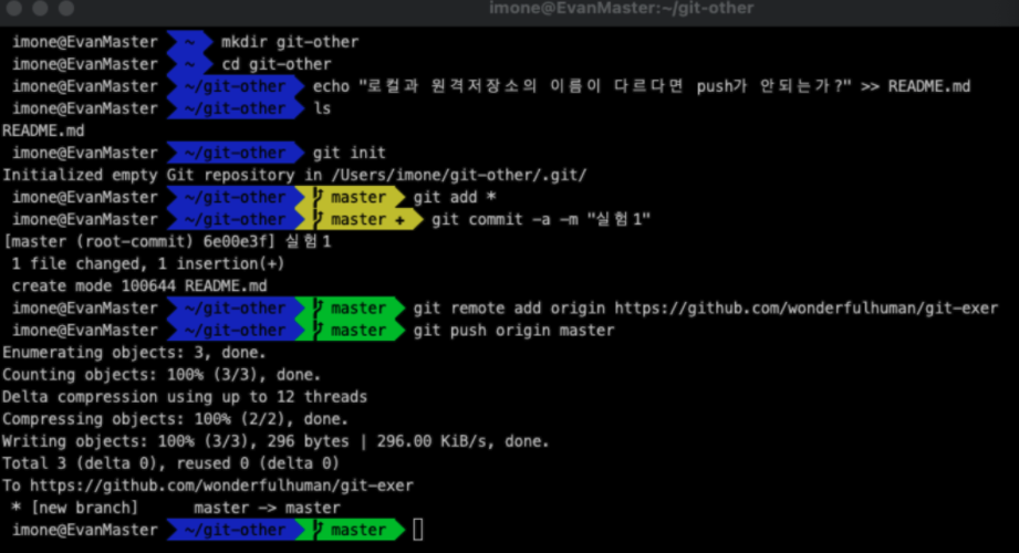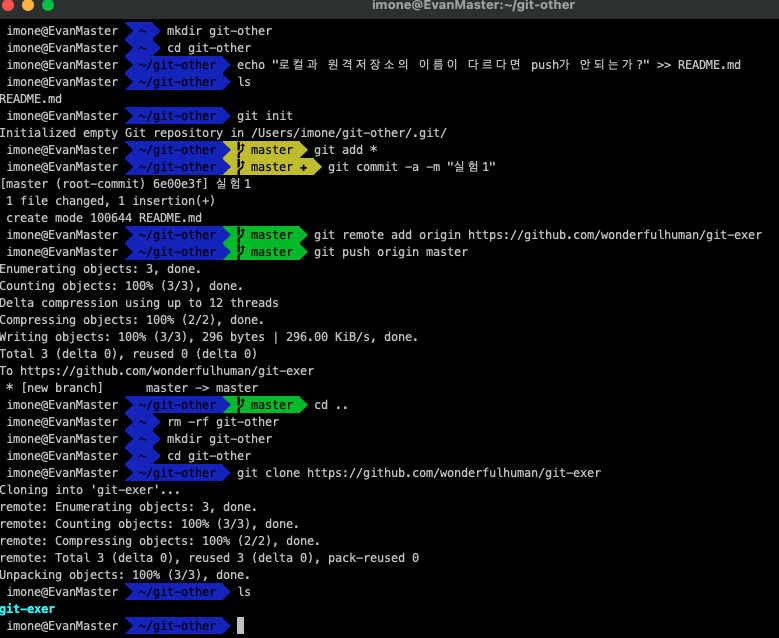 이 호기심을 깃을 처음 접할때부터 가지고있었는데 해결을 미루다보니 무조건 그냥 clone 하는 방식으로 내 로컬로 깃 저장소를 아예 받아오기만 했었는데 오늘 실험을 통해서 이제는 원격저장소이든 로컬저장소이든 자유자재로 push와 clone을 할 자신감이 생겼다. 나의 호기심을 다시한번 말하자면 다음과 같은데 원격저장소에 git-exer이라는 저장소를 생성했고 이 원격저장소에 내가 로컬에서 작업한 파일들을 push하려고 한다 그러한 상황에서 로컬에서 작업한 폴더 이름이 git-exer이 아닌 git-other이면 원격 저장소와 로컬 저장소의 이름이 다르게 되는데 이 상황에서 푸시가 되는지 안되는지 궁금했다. git push의 동작방식이 로컬의 폴더 이름을 가지고 그에 맞는 원격레포의 이름을 찾아 push하는 것이 아닌가 라는 생각이 들었기 때문이다.
