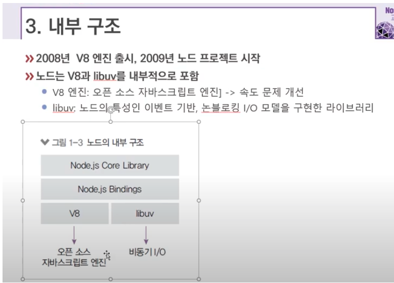 위의 사진은 자바스크립트의 내부 구조이며 실제로 V8은 C++을 기반으로 만들어 졌으며 여기서 더 눈여겨 볼것은 바로 libuv이다. libuv는 자바스크립트와 노드에서 비동기를 구현해준다는 측면에서 매우 중요하기 때문이다. 또한 노드가 뜬 이유중에 하나는 싱글 스레드이면서 비동기인 모델이기 때문인데 이게 엄청난 장점이다. 자바와 같은 언어에서는 멀티스레딩을 하곤했지만 그 멀티스레딩을 구현하는 작업자체가 쉬운일이 아니다. 따라서 멀티스레딩을 가지고 충분한 성능을 내지못하는사람이 많고 실제로 원하는 성능을 내지 못한다. 그래서 멀티 스레딩을 잘활용하지 못하는 초보 개발자는 많이 해메게 되는데 노드는 이러한 작업을 싱글스레드와 비동기 방식으로 조금더 쉽게 해주어 빠른 성능을 이끌어낼수 있다.