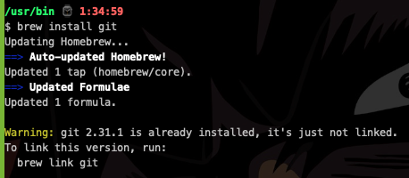 이미 /usr/local/bin/git이라는 타겟이 있기때문에 심볼릭링크를 연결하지 못했다는 에러가 떴다. 그래서 다양한 조언 메시지를 또 얻을수 있었는데