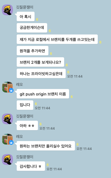 이 분의 고민은 현재 자기가 로컬에서 두개의 브랜치를 사용하고 있는데 이걸 푸시한다면 원격(깃헙)에는 두개의 브랜치가 모두 올라가느냐 라는 질문인데,