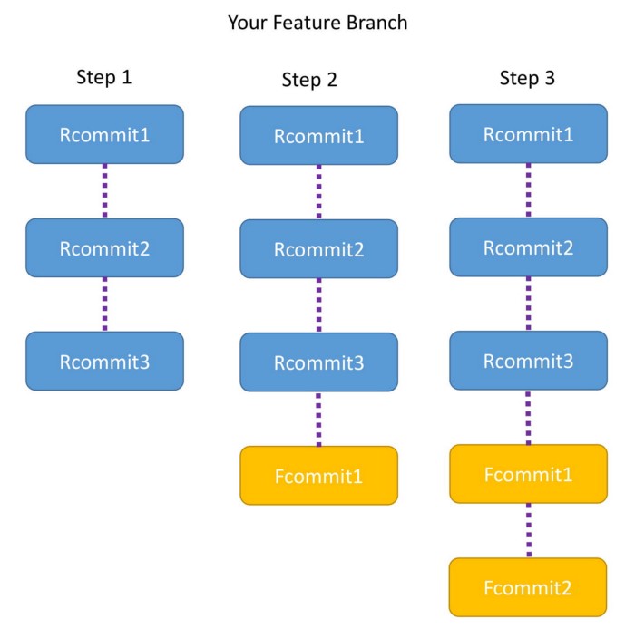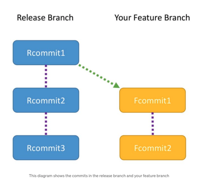 Release Branch에 Rcommit1, Rcommit2, Rcommit3 총 3개의 커밋이 있는상황이고Feature Branch는 Fcommit1, Fcommit2 이렇게 2개의 커밋이 있는 상황입니다.이때 Feature 브랜치는 Rcommit1만 존재했을때 만들어진 브랜치이며