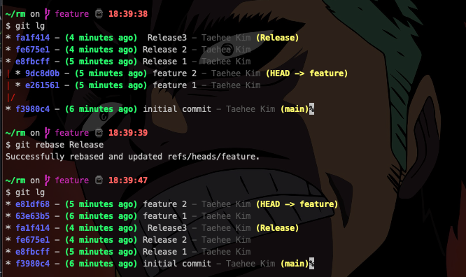 git lg(원래는 git log가 원래 명령어 입니다 저는 지금 alias를 사용했기때문에 커스터마이징 된 깃 명령어를 사용하고 있습니다.) 명령어를 통해 히스토리를 조회해봤을때 제일 위의 사진과 똑같은 상황을 연출해 보았습니다. - Feature브랜치에 Release브랜치를