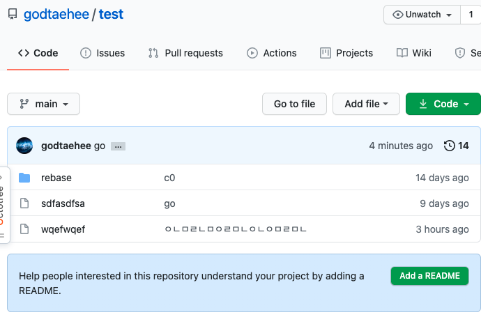 실제로 위 사진을 보면 나의 깃헙 test레포를 클론 받아와서 wqefwqe라는 파일(파일 이름 아무 의미없음 그냥 변경사항 빨리 만들려다 보니..)을 git rm --cached를 통해 지웠는데 이 파일은 deleted상태이면서 Untrack상태이며 이것을 커밋후 푸시를 진행하게 되면 아래와 같이 원격에서 실제로 저 파일이 없는것을 확인 할수 있다.