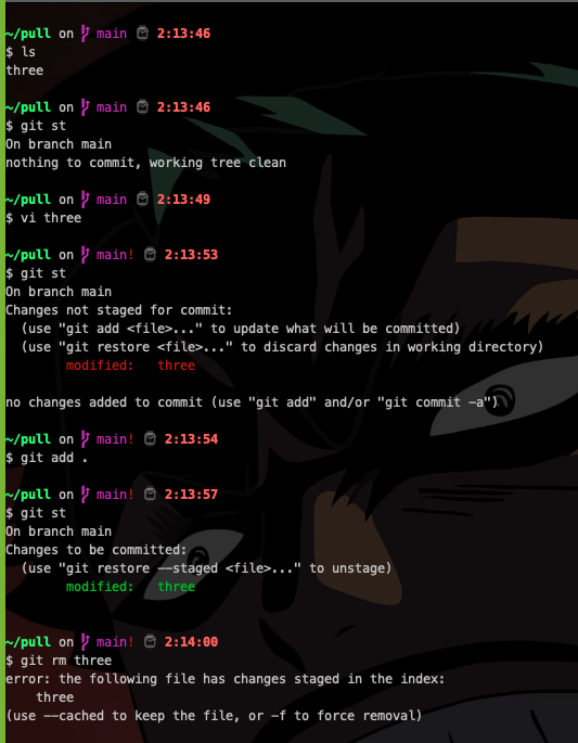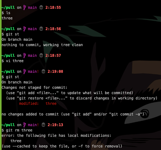 이미 스테이지 영역에 올라가 있다는 말은 변경사항을 커밋을 하려고 저희가 준비를 시켜놨다고 깃에게 알려주는것이여서 깃은 아 이게 저장(commit)을 해야하는 중요한 변경사항이구나 라고 인식을 하고있습니다. 근데 갑자기 그 중요한것을 삭제하려한다? 용납못하겠죠? 그래서 오류를 띄우는 것입니다. 오류 내용도 three라는 파일이 staging영역에 있다는 내용이죠. 근데 그래도 사람이 우선이니 강제로 삭제하고 싶다면 앞서 말씀드린것처럼 git rm -f를 통해서 강제삭제가 가능합니다. 자 다음 두번째 경우를 보시죠 이 경우는 변경사항이 생겼는데 삭제하려고 하는것입니다.