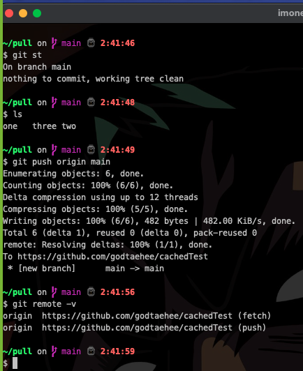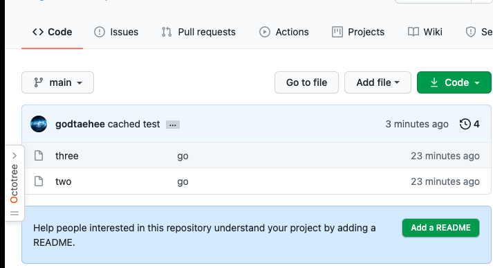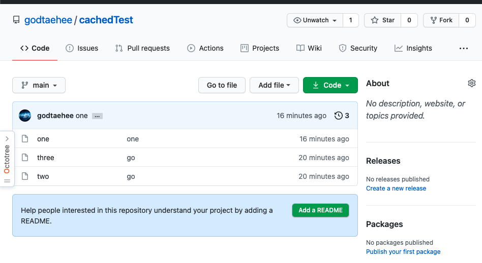 자 이제 중요합니다. 저는 git rm --cached로 로컬에는 존재하지만 추적대상에서 제외를 시켰습니다. 그렇게 하고난후 커밋후 푸시까지 마쳤는데요 깃헙에 가서 결과가 어떻게 되어있는지 봅시다. 보기전에 ls 명령어로 제 로컬에 분명히 one, two, three 파일이 있음에 주목합니다. 그리고 커밋 해쉬값을 보면 ae4fe06..1bf300b이렇게 되어있는데 이것도 유의깊게 보세요