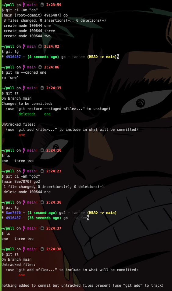 위의 사진은 git rm명령어를 실행한 모습인데 git rm을 실행하기 이전 ls로 현재 one, two, three 총 3개의 파일이 있는것을 알수 있습니다. 그후 git rm명령어를 통해 one이라는 파일을 삭제했고 git status명령어로 변경사항을 확인해보니 Changes to be committed의 deleted된 one파일이 스테이징 영역에 올라가 있는것을 확인할 수 있는데요, 이것은 그냥 저희가 파일을 평소처럼 수정하고 git add를 해준것과 다를게 하나도 없습니다.