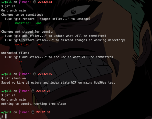 다음과 같이 git stash는 Tracked 상태의 파일인 one, two파일만 stash 스택에 저장했으며 Untracked상태의 파일인 five는 stash 스택에 저장하지 않았다. 아래의 사진은 똑같은 상황을 만들고 -u옵션을 붙혔을때의 git status로 상태를 확인한 사진이다.