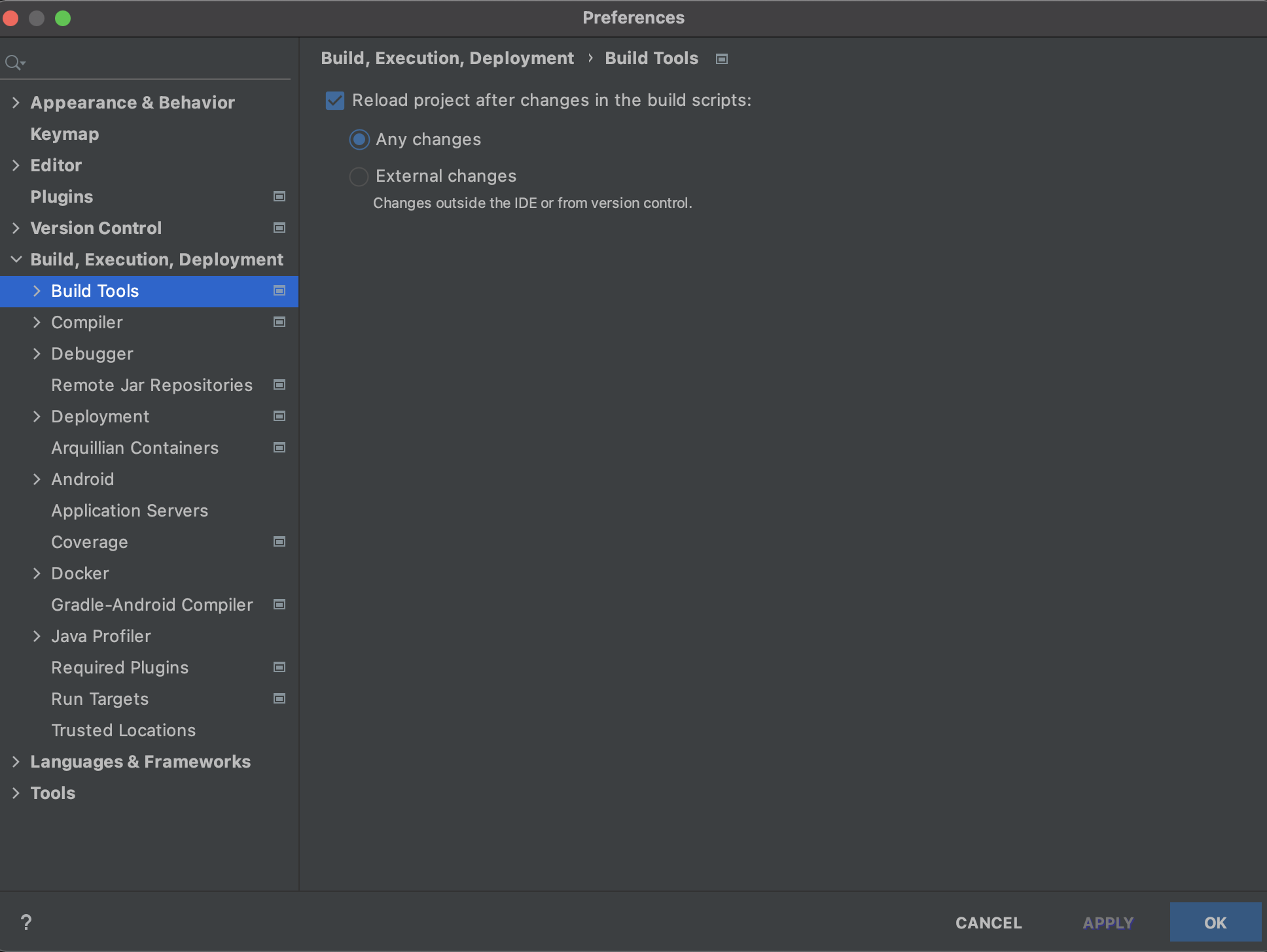 맥 기준 Preference - Build, Execution, Deployment -> Build Tools 에 Any changes를 체크해주면 됩니다.