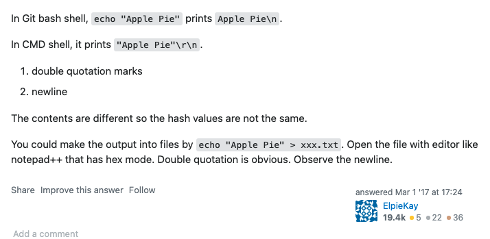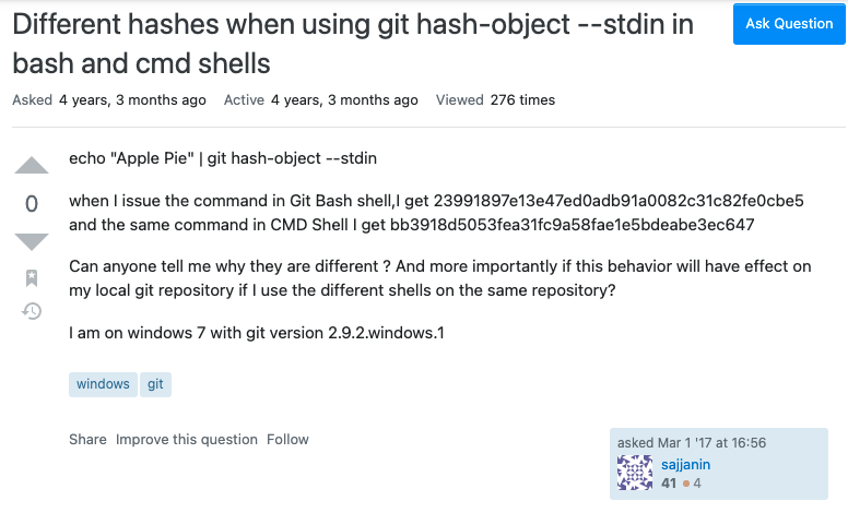 echo "Apple Pie" | git hash-object --stdin를 통해 echo "Apple Pie"라는 데이터를 가진 hash-object를 생성했는데 Git Bash쉘에서와 자기 컴퓨터에 내장되어있는 기본 Terminal에서의 해시값이 다른데 왜 다른건지 모르겠다는 질문인데 똑같은 레포에서 다른 쉘로 hash-object를 생성할때 내용보다 더 중요하게 작용하는 어떤 요소가 깃의 시스템에 내장되어있는지에 대해서도 물어보고있는데 결론은 그냥 그런요소는 없고 내용이 실제로 달랐다.