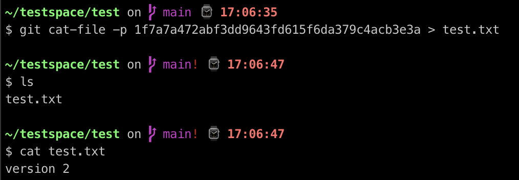 앞에서와 같이 Git 데이터베이스에 개체를 저장하고 나면 이후에는 git cat-file명령으로 저장한 데이터를 불러올 수있다. git cat-file -p명령어로 파일 내용을 출력할수 있다.