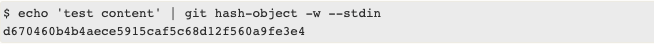 이 개념을 설명하기 위해 Plumbing명령어를 예로 들면 git hash-object명령이 있는데 이 명령어에 데이터를 주게되면 .git/objects 디렉토리(즉 개체 데이터베이스)에 저장하고 그 데이터에 접근할 수 있는 key를 알려주며 이 key는 저장소 내에서 유일하다 따라서 우리는 이 명령어를 통해 실제로 Git이 Content-addressable 파일시스템이라는것을 알게 될것이다.