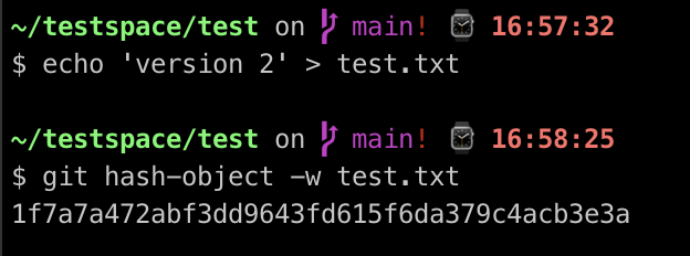 object에 저장한 후 test.txt를 version 2라는 내용을 변경을 하고 역시 object로 생성해 둔다.