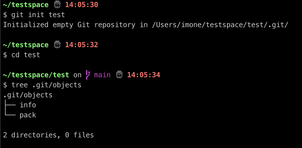 깃이 관리하는 test폴더를 하나 만들고 .git/objects의 폴더구조를 보면 파일같은건 없다.