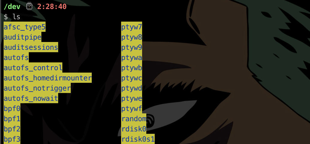 장치파일이라고 불리는 많은 파일이 존재한다. 리눅스의 특수한 파일이라고 불리는데, 장치파일을 통해 리눅스에 설치되어있는 많은 하드웨어가 작동하며 응용프로그램들이 이 장치파일을 이용해 하드웨어에 접근해 사용하게 된다. 장치파일이란 말 그대로 장치를 제어하기위한 파일이며 하드웨어(프린터, 팩스, 모니터)이런것들을 제어하기위한 파일들이다. 실제로 아래 사진을 보면 파일 하나하나당 장치 하나라고 간주한다.
