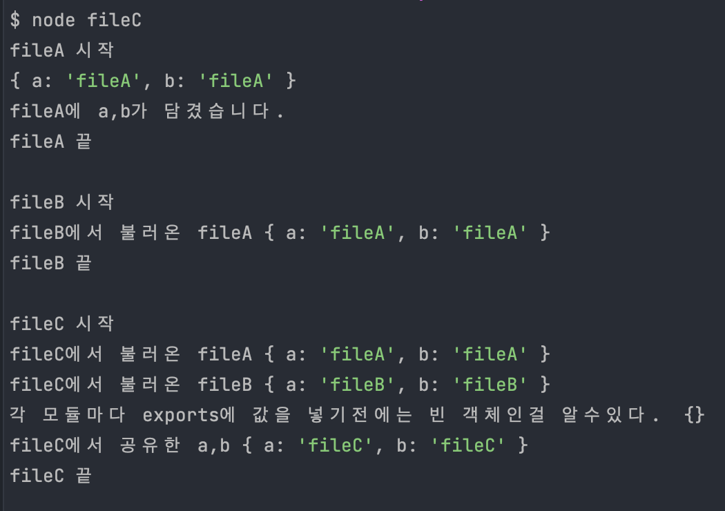 다음 세 파일을 만들고 fileC.js를 실행시켜보면 결과는 다음과 같다.