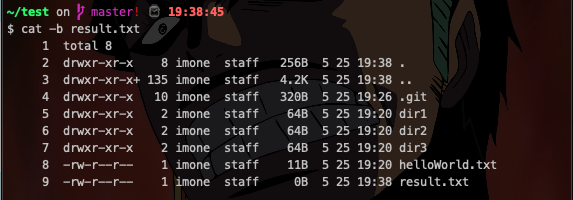 밑에 cat -b result.txt라는 명령어가 나오는데 이 명령어는 cat(명령어) -b(옵션) result.txt(파일명)의 형태를 가지고 있다. 우선 cat명령어는 파일의 내용을 보는 명령어 이며 당연히 디렉토리에는 사용불가능한 명령어이다 그래서 그냥 cat result.txt 하면 그냥 result.txt파일의 내용을 보는것인데 -b옵션을 주면 한줄한줄 번호를 붙혀서 출력해준다. 나는 설명을 하기위해 저렇게 줄번호가 보이게 출력을 의도적으로 한 것이다. 여러분도 혹시 필요하면 사용하길 바란다.