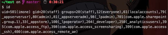 파일 권한 옆에 숫자는 디렉토리일 경우 그 디렉토리 안에있는 파일과 폴더의 개수를 나타내며 파일의 경우 파일시스템 내부에 존재하는 파일을 가리키는 하드링크의 개수를 나타내는데 파일의 경우 하드링크의 개수는 무조건 하나이다. 그 옆의 imone은 이 폴더혹은 파일의 소유자를 나타내며 그 바로옆에 staff는 그룹으로써의 소유자를 말한다. 이것은 컴퓨터마다 다를것이다. 리눅스를 사용하고있다면 id명령어를 통해서 나 같은경우에는 imone, staff가 유저이고 그룹인것을 단번에 알수있다. 아래 사진처럼 말이다.